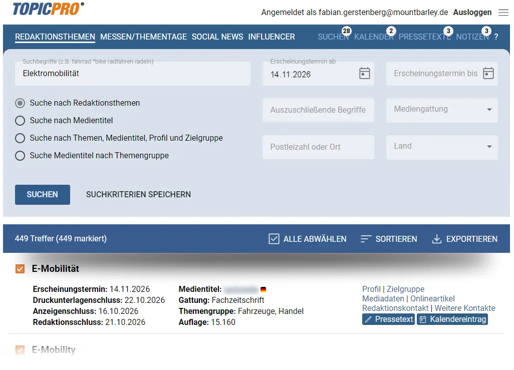 In TOPIC PRO finden Sie die passenden Redakteure, Influencer und Freie Journalisten für Ihre individuellen Projekte. Es lassen sich blitzschnell zielgenaue PR-Verteiler erstellen und exportieren.