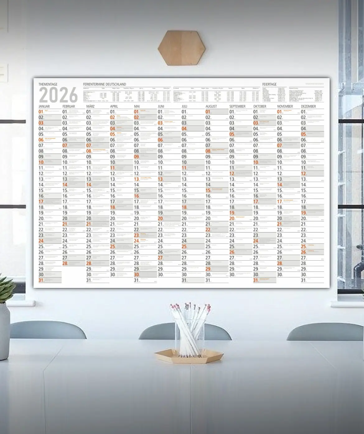 Auf unserem großformatigen Wandkalender finden Sie mehr als 600 Thementage sowie die nationalen und regionalen Feiertage und Ferientermine 2026. Die Thementage sind blass in die jeweiligen Datumsfelder gedruckt.